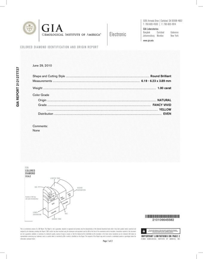 This is a beautiful 1.00 carat, GIA certified ZIMI Fancy VIVID Yellow, Round Brilliant shape and cut Diamond rated with an I1 clarity. A beautiful Natural Fancy VIVID Yellow Colored Diamond that will look stunning when set. This diamond has a beautiful yellow color. When GIA grades a colored diamond they usually give a Fancy color grade to only a diamond that has the strongest saturation of its body color accompanied by a fullest tone. This Fancy is a rated perfect for its color and has excellent luster and brilliance.