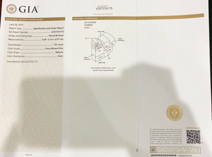 This is a beautiful 1.01 carat, GIA certified Fancy Brown Pink, Round shape Diamond with an I1 clarity. A beautiful Natural Fancy Brown Pink Diamond that will look stunning when set. This diamond has a beautiful bright pink color. When GIA grades a colored diamond they usually give a Fancy color grade to only a diamond that has a moderate saturation of its body color accompanied by a bright tone.
