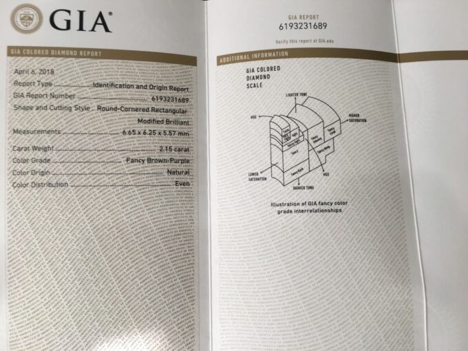 This is a beautiful 2.15 carat, GIA certified Fancy Brown Purple, Cushion shape Diamond with an SI2 clarity. A beautiful Natural Fancy Brown Purple Diamond that will look stunning when set. This diamond has a beautiful Rich Purple color. When GIA grades a colored diamond they usually give a Fancy color grade to only a diamond that has a moderate saturation of its body color accompanied by a bright tone.