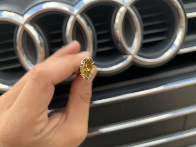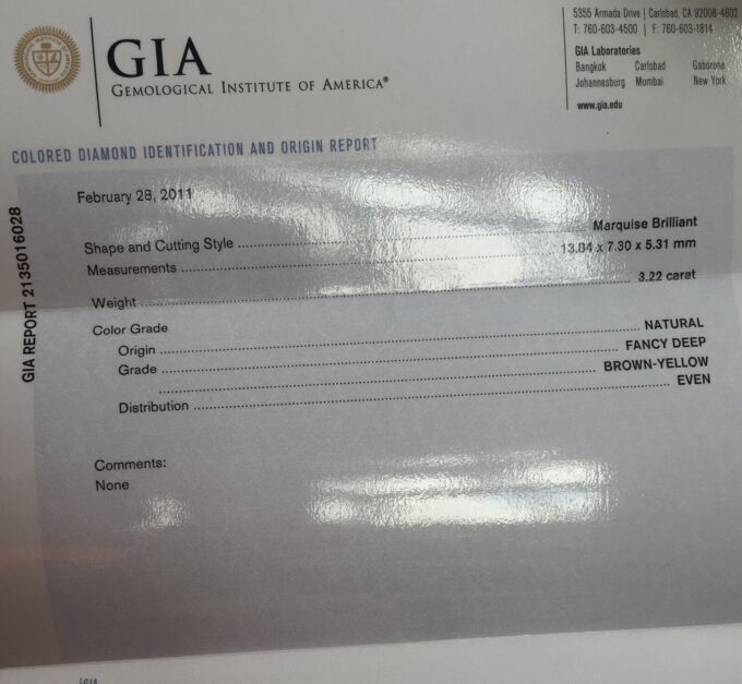 This is a HUGE, BEAUTIFUL loose and RARE GIA certified 100% NATURAL 3.22CT Marquise Brilliant Diamond that is rated with a NATURAL Fancy DEEP Brown – Yellow color and a I1 clarity. This diamond is GIA certified and does come with the certificate!