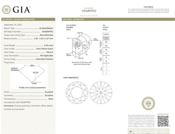 This is a beautiful loose GIA certified 100% NATURAL .30CT Round Brilliant Diamond that is rated with a NATURAL Yellow Green PIK Brown color and a Internal Flawless clarity