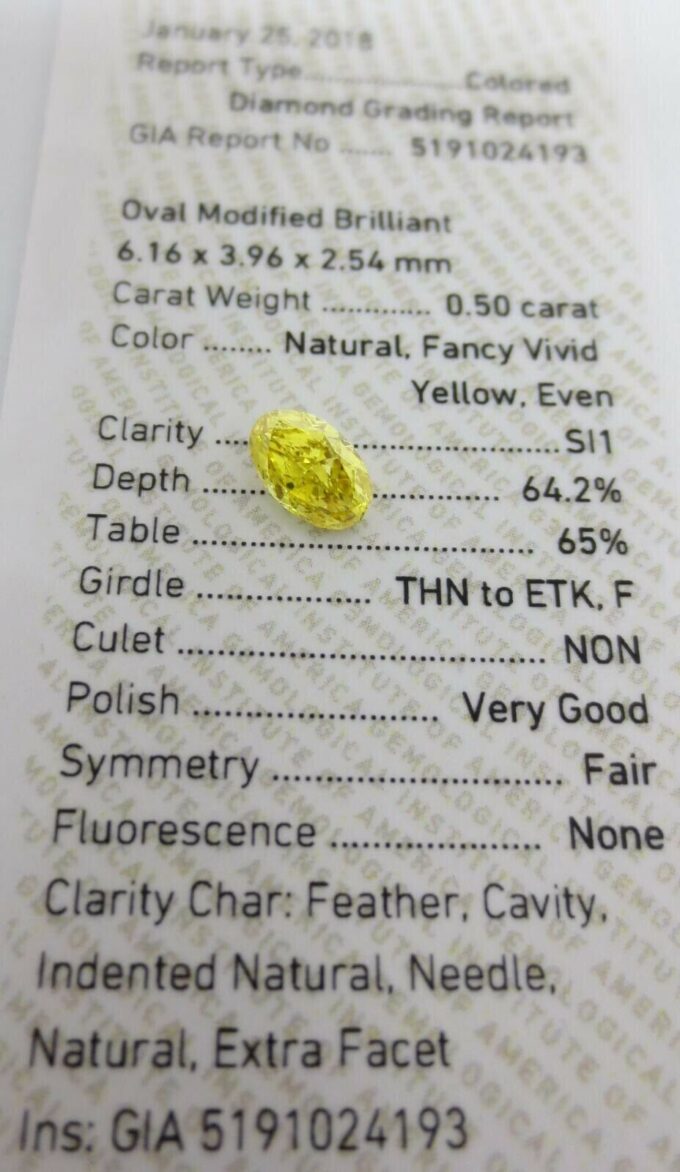 This is a beautiful loose GIA certified 100% NATURAL .50CT OVAL Brilliant Diamond that is rated with a NATURAL Fancy VIVID Yellow color and a SI1 clarity. The diamond is eye clean!