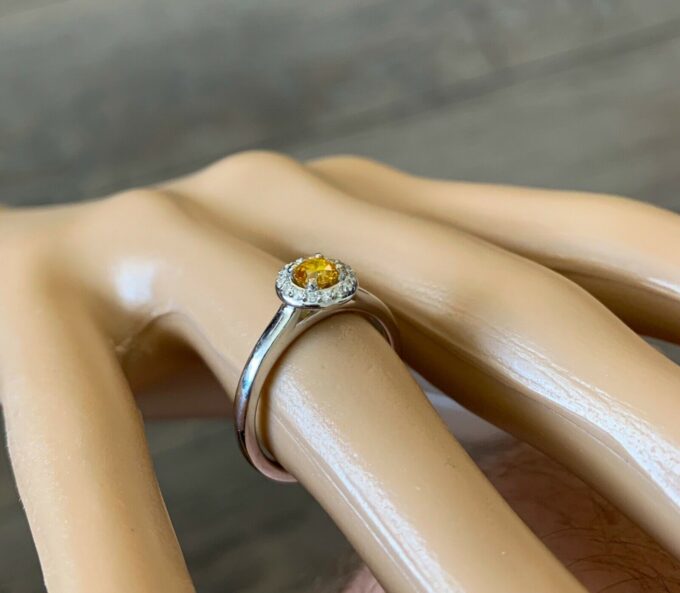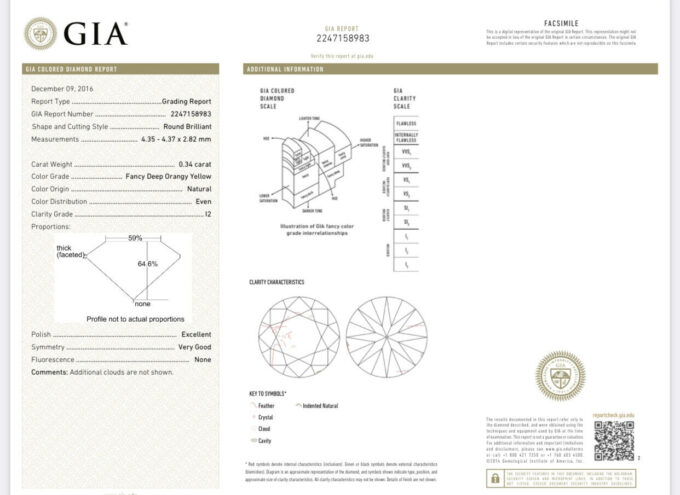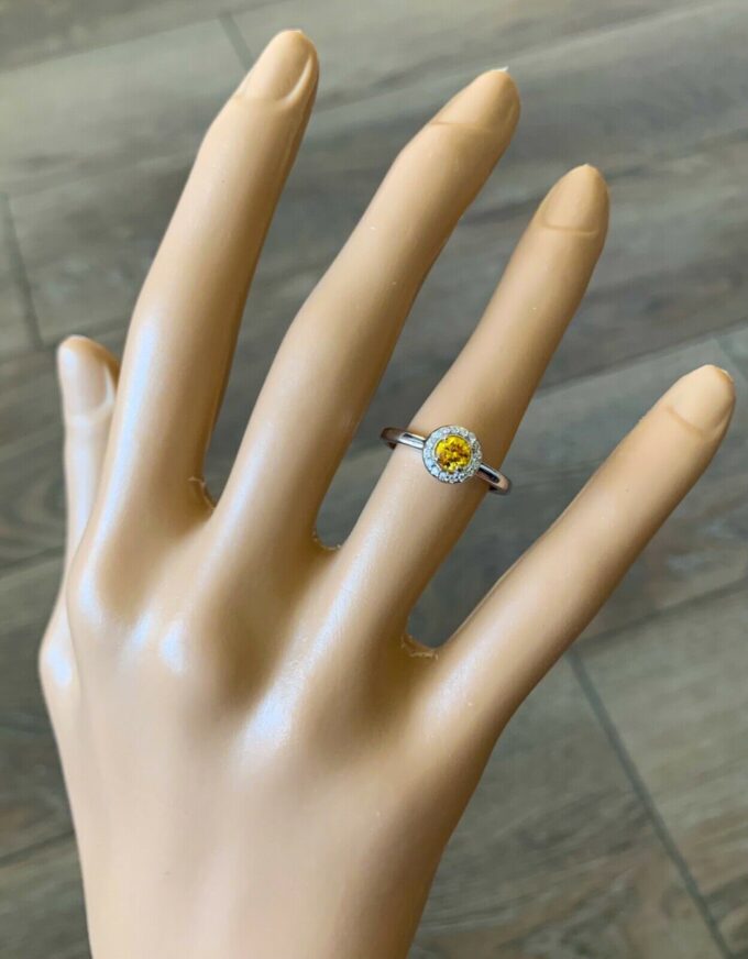 This is a beautiful natura .34CT Fancy Deep Orangy Yellow Round Brilliant I2 clarity diamond set in a Gorgeous 14K White Gold Halo Setting with .36 of clean white melee . This diamond is a 100% natural earth mined diamond with no treatments of any kind. Here at Jabbour’s we want you to have the most beautiful jewelry.