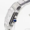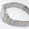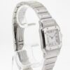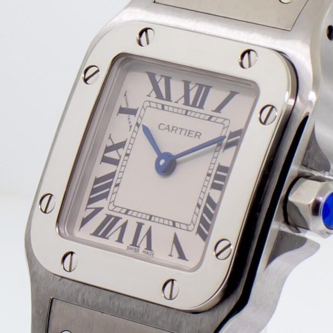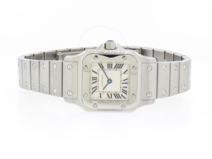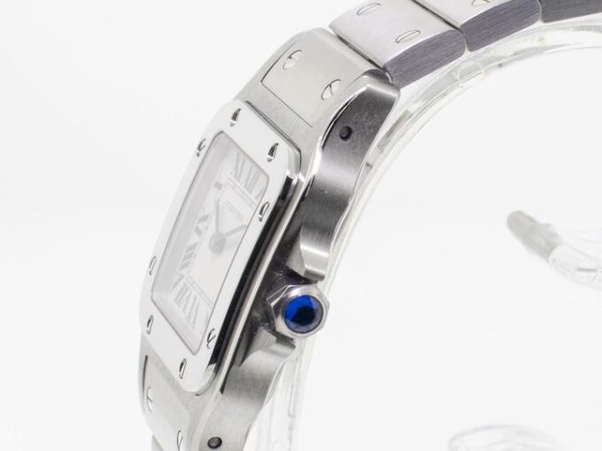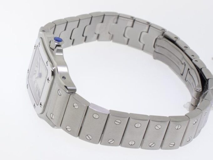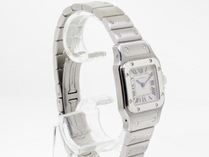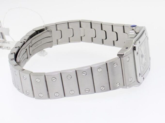 Guaranteed Authentic Brand-New Ladies’ Cartier Santos Collection Galbee Quartz Watch with a 24mm stainless steel case. This fine timepiece is brand-new and features a silver dial, quartz movement, and a stainless steel bracelet.