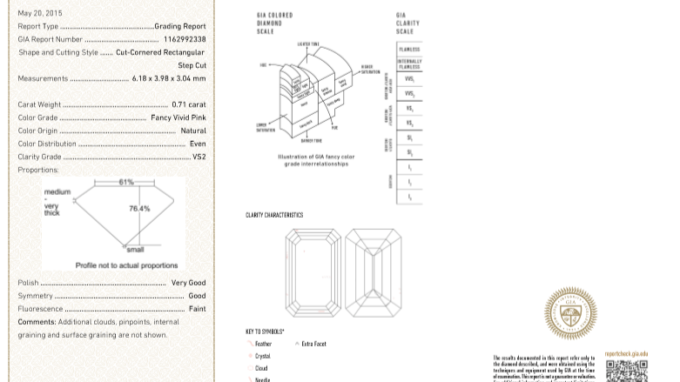 This is a beautiful .71 carat, GIA certified Fancy Intense Pink, Emerald shape and cut Diamond rated with an VS2 clarity. A beautiful Natural Fancy VIVID Pink Colored Diamond that will look stunning when set. This diamond has a beautiful VIVID Pink color. This is a gorgeous Fancy VIVID Pink Colored Diamond for sale. When GIA grades a colored diamond they usually give a Fancy VIVID color grade to only a diamond that has the strongest saturation of its body color accompanied by the brightest tone. This Fancy VIVID color grade is rated perfect for its color and has excellent luster and brilliance. Want to buy this diamond now? Let a Diamond Specialist help you.