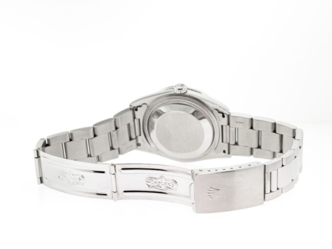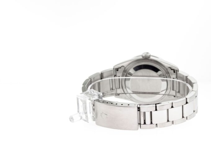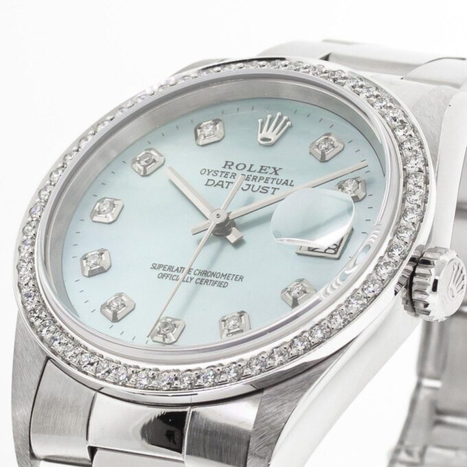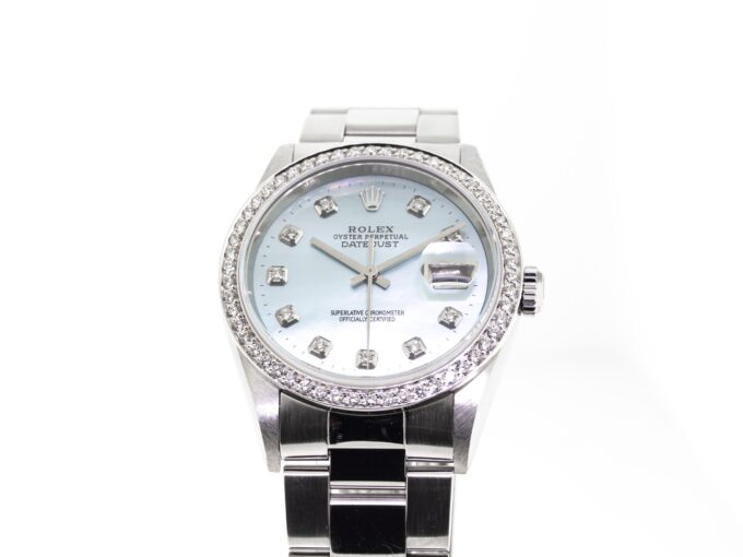 Guaranteed Authentic Rolex Datejust watch with a 36mm stainless steel case and Blue Mother of Pearl diamond dial. This fine timepiece features a custom diamond bezel and a stainless steel Oyster Bracelet. This watch is in excellent condition.