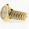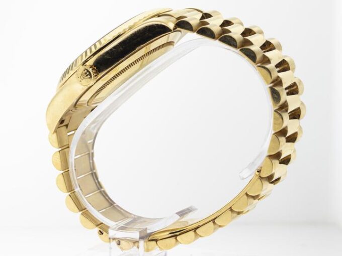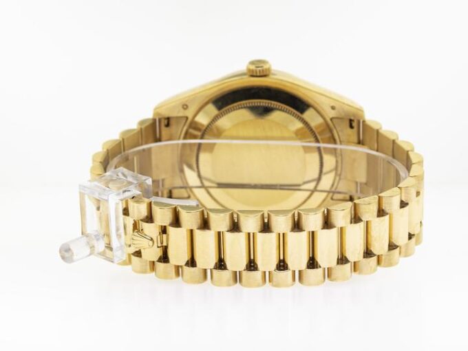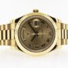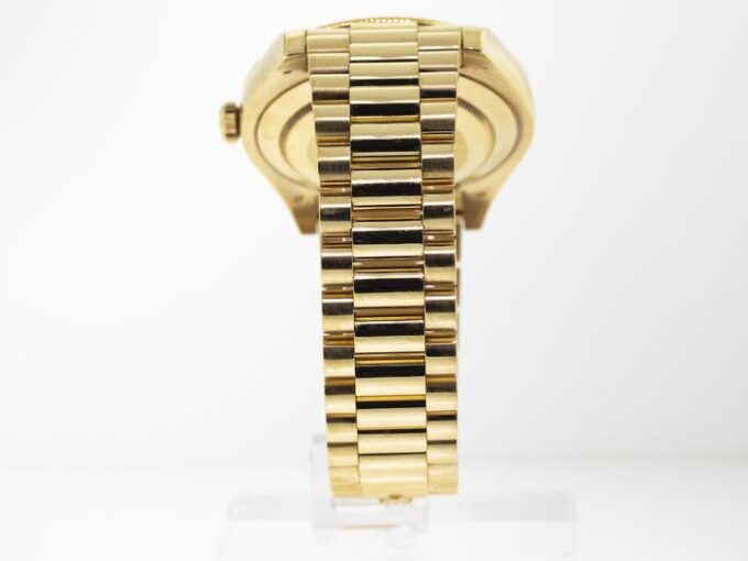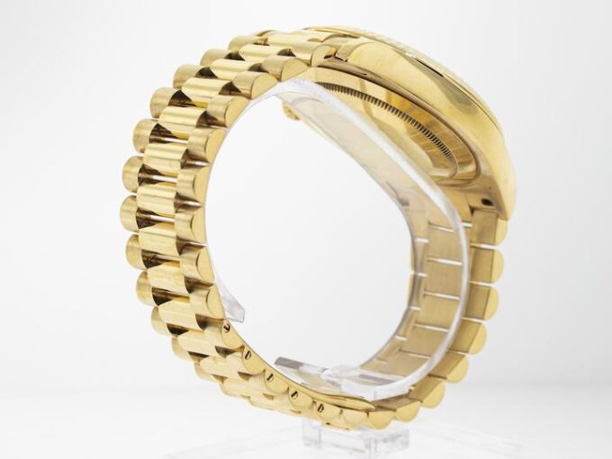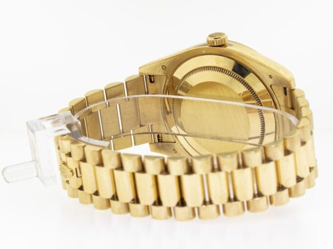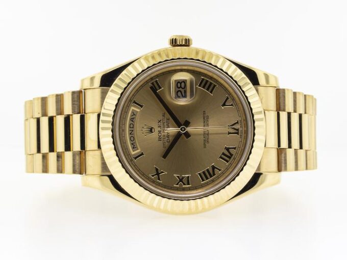 Guaranteed Authentic Men’s Rolex Presidential Day-Date with a 41mm 18K yellow gold case and a champagne Roman dial. This fine timepiece features an 18K yellow gold fluted bezel and a President bracelet. This watch is in excellent condition.