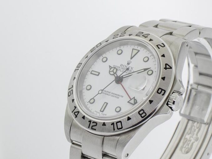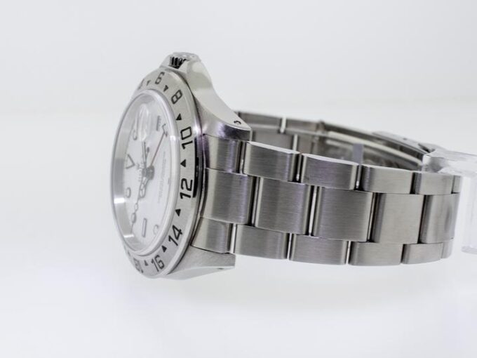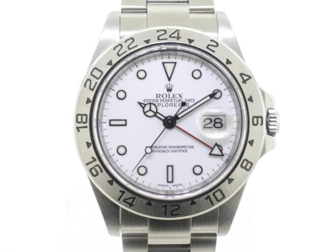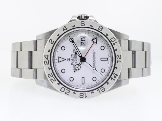 Guaranteed Authentic Men’s Rolex Explorer II with a 40mm stainless steel case and a white dial. This fine timepiece features a 24-hour stainless steel bezel and hand, independent 12-hour hand, and Oyster bracelet. This watch is in excellent condition.