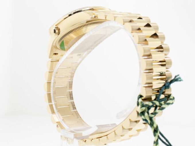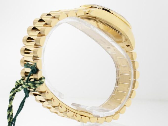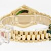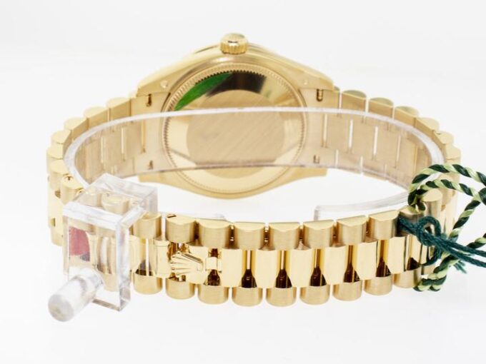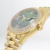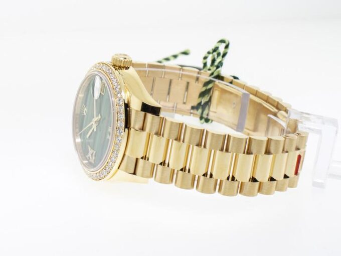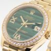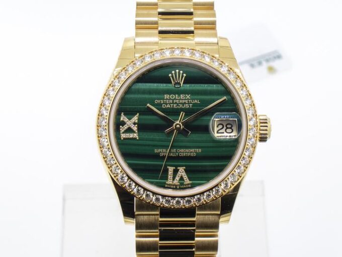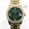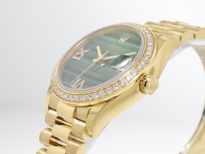 Guaranteed Authentic Rolex Lady-Datejust with a 31mm 18K yellow gold case and a Malachite Roman dial. This fine timepiece features a diamond bezel and an 18K yellow gold President bracelet. This watch is in excellent condition.