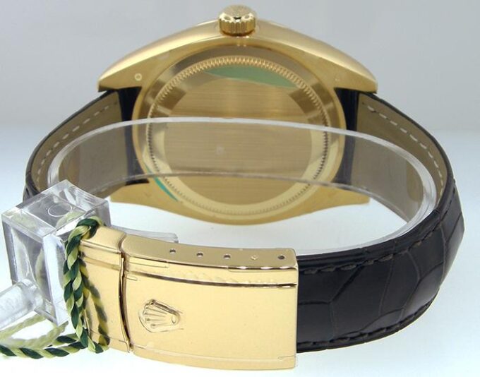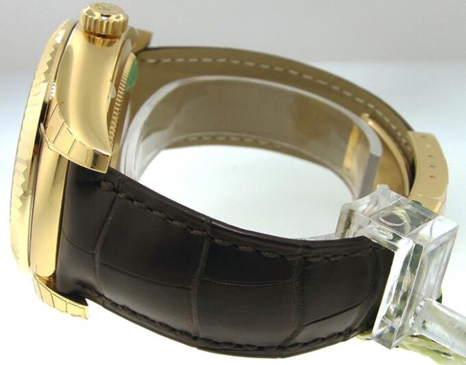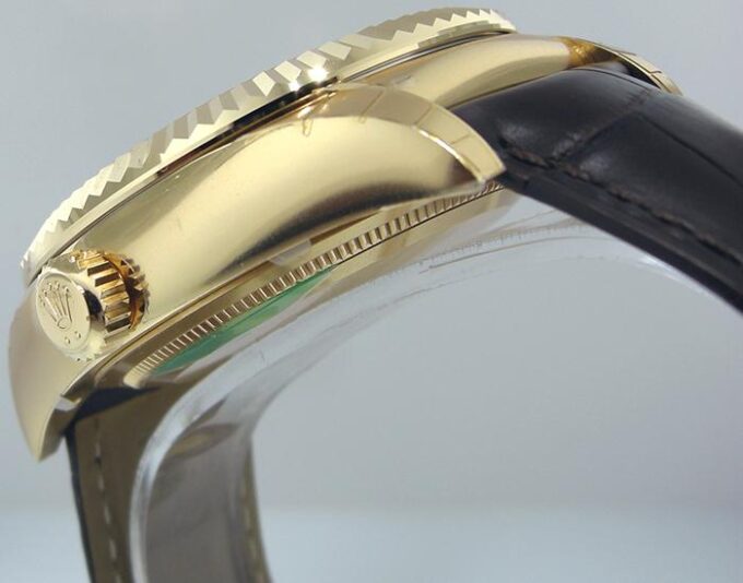 Guaranteed Authentic Rolex Sky-Dweller with a 42mm 18K yellow gold case and a champagne Arabic dial. This fine timepiece features a date indicator, an off-center command ring, an 18K yellow gold fluted bezel, and a brown leather strap with an 18K yellow gold clasp. This watch is unworn with tags and its box.