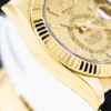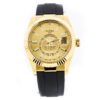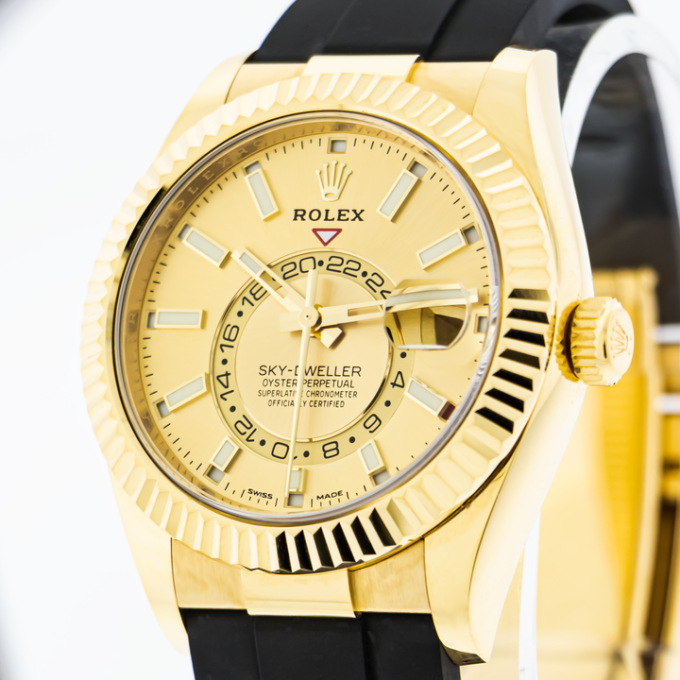Guaranteed Authentic Rolex Sky-Dweller with a 42mm 18K Yellow Gold Case and a champagne index dial. This fine timepiece is waterproof up to 100 meters and features luminous indices and hands, a date indicator, an annual calendar, a second time zone, an 18K Yellow Gold fluted bezel, and an Oysterflex black rubber bracelet. This watch is brand new with tags and its box.