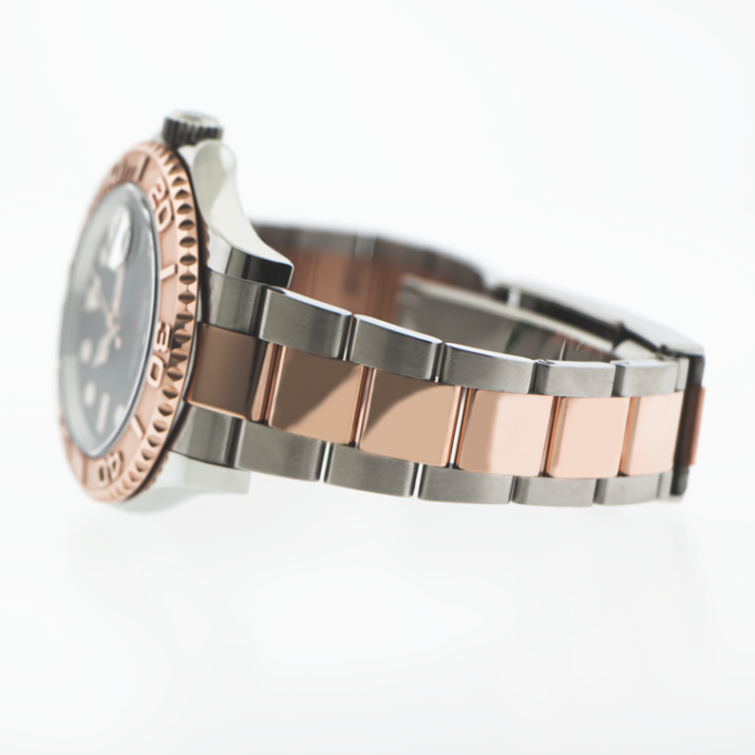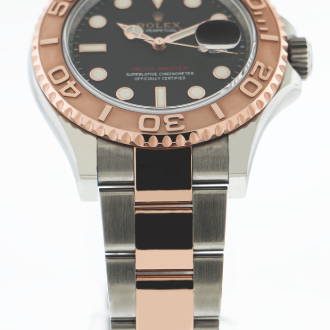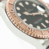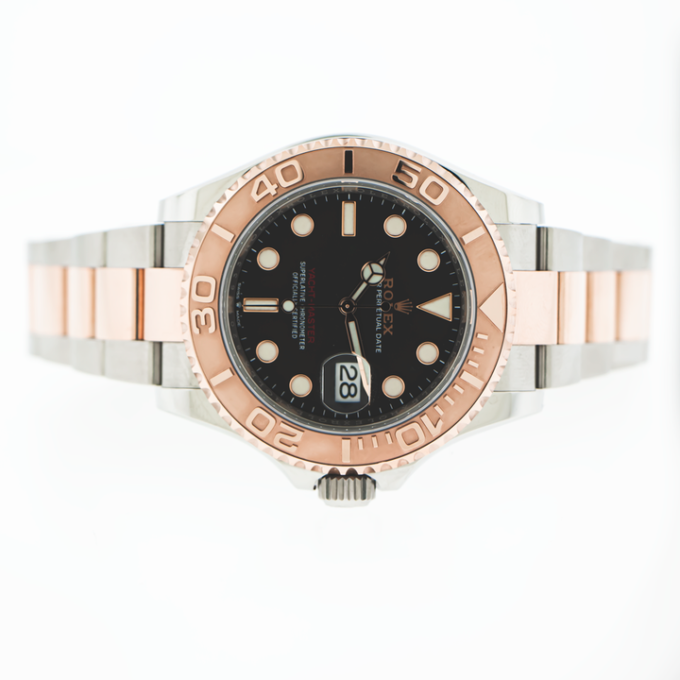 Guaranteed Authentic Rolex Yacht-Master with a 40mm Stainless Steel case and a black index dial. This fine timepiece is waterproof up to 100 meters and features a date indicator, luminous hands and indices, an 18K Rose Gold rotating bezel, and a two-tone 18K Rose Gold and Stainless Steel Oyster Bracelet with a fold clasp. This watch is brand new with tags and its box.